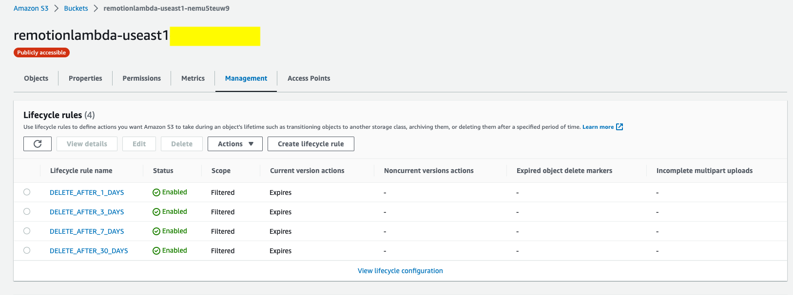 在你的 S3 桶中,在“管理”下,你应该看到 4 条生命周期规则。