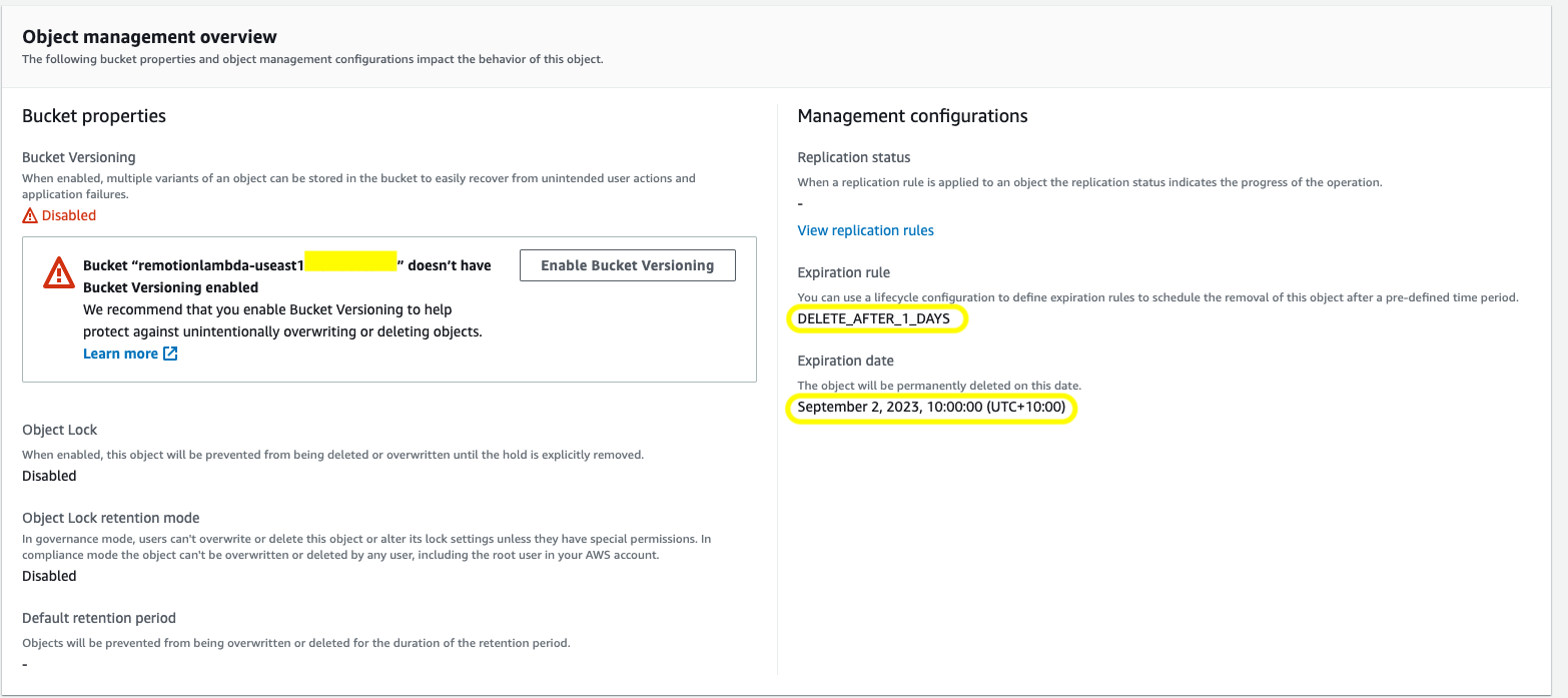 在 AWS 存储桶上启用生命周期规则。deleteAfter 选项渲染视频。